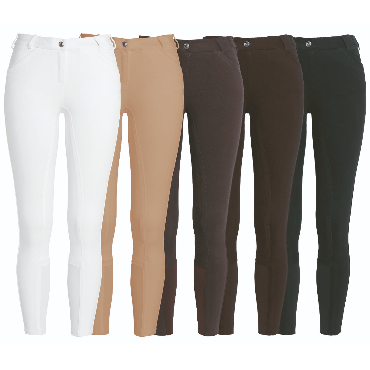 Pantalón de montar de punto Junior. Con estilo clásico para favorecer a todos los jinetes. Confeccionado con un algodón /spandex de alta calidad que garantiza su comodidad. Presenta dos bolsillos delanteros con detalle de ribete en contraste, bragueta con cremallera central con auto-bloqueo y cierre de gancho y bucle de calidad. Diseñado con un corte tradicional y culera completa elástica y antideslizante de piel sintética. Cuenta con una sección de tejido de punto de menor volumen en el extremo de la pierna, que permite una colocación más cómoda de la bota de montar. Son la mejor opción para el jinete principiante.