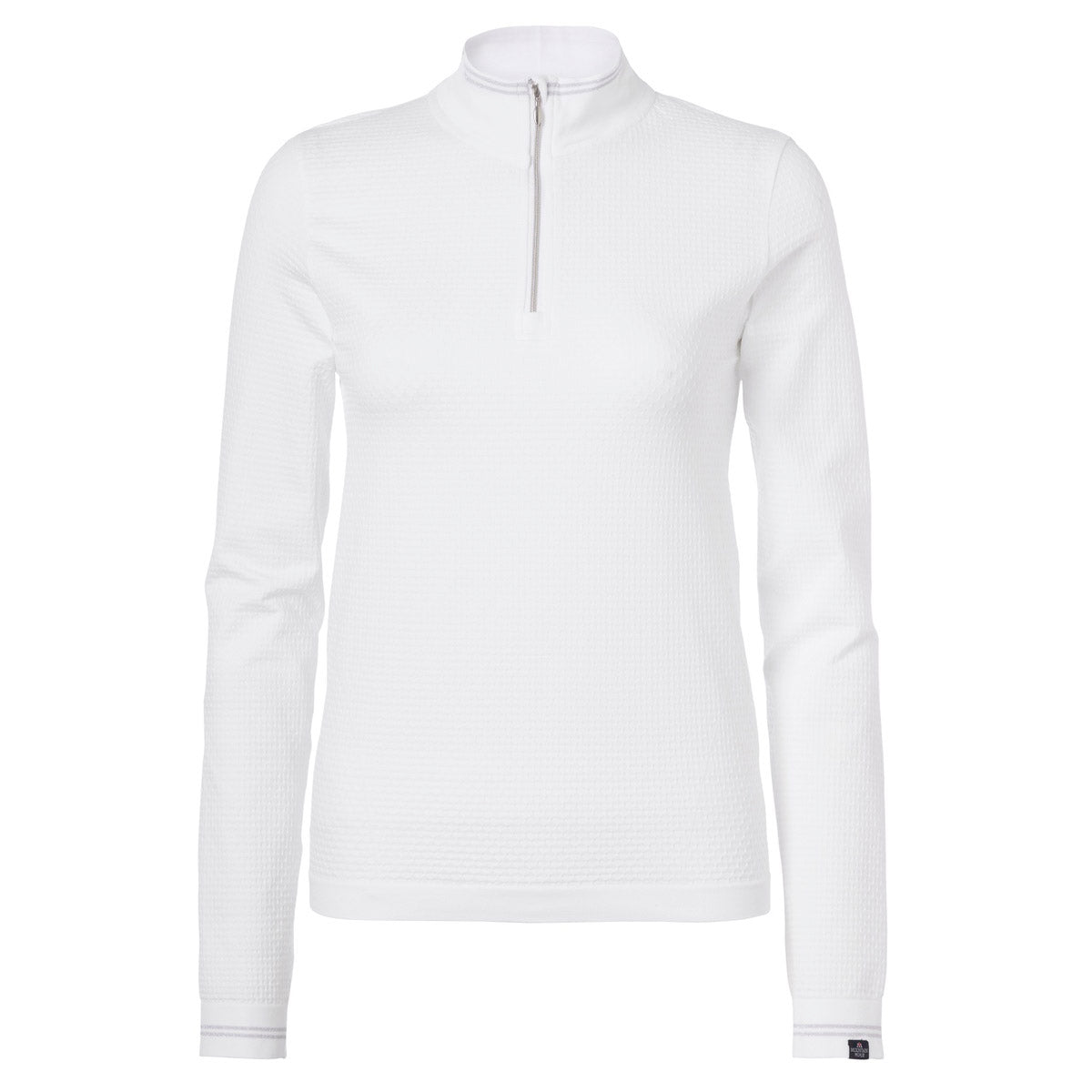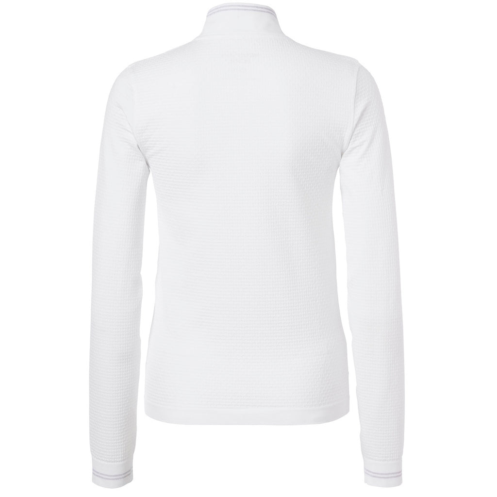 Polo técnico de concurso sin costuras. Confeccionado con tejido de punto de secado rápido, con efecto de estampado y rayas plateadas decorativas en el cuello y en las terminaciones de las mangas. Polo sin costuras laterales que resulta muy femenino y cómodo. Presenta cremallera frontal en espiral de 1/3 y tiradores plateados, sección de tejido interior protectora y tirador con protección de barbilla en la parte superior del cuello. Muestra el Logotipo de MH.